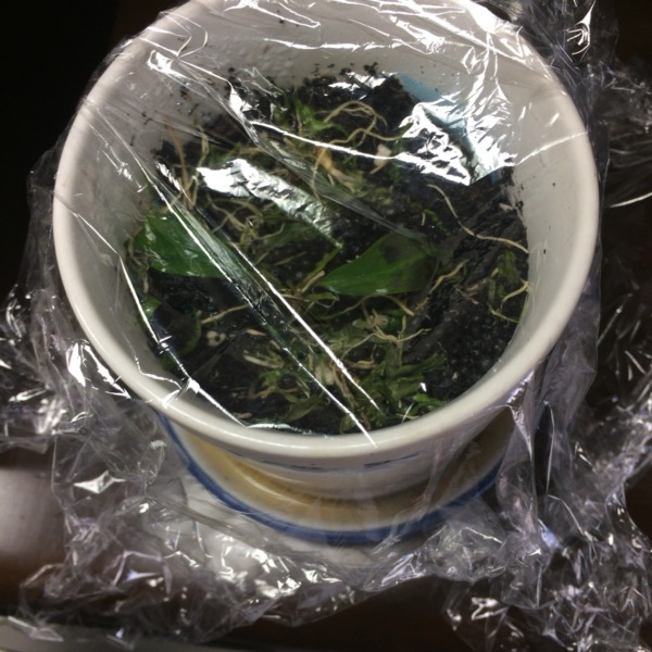 ブセファランドの水中葉を水上化させたいので、コップに土を入れて、時々霧吹きで...