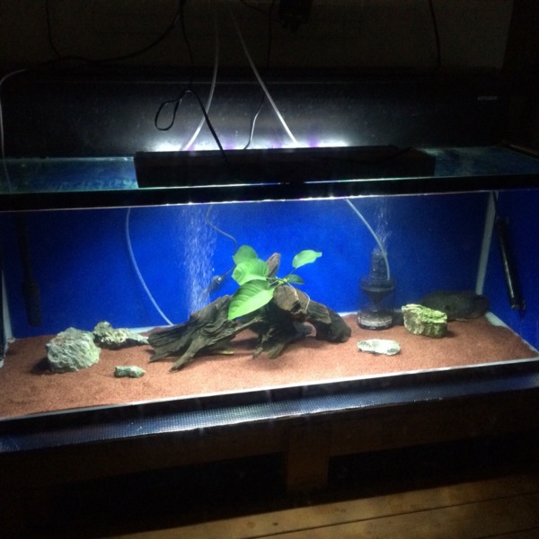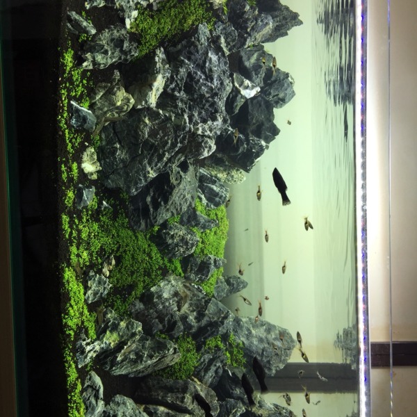 120の水槽に90のLED1つでもかなり明るいです!レイアウトに石を追加しました
