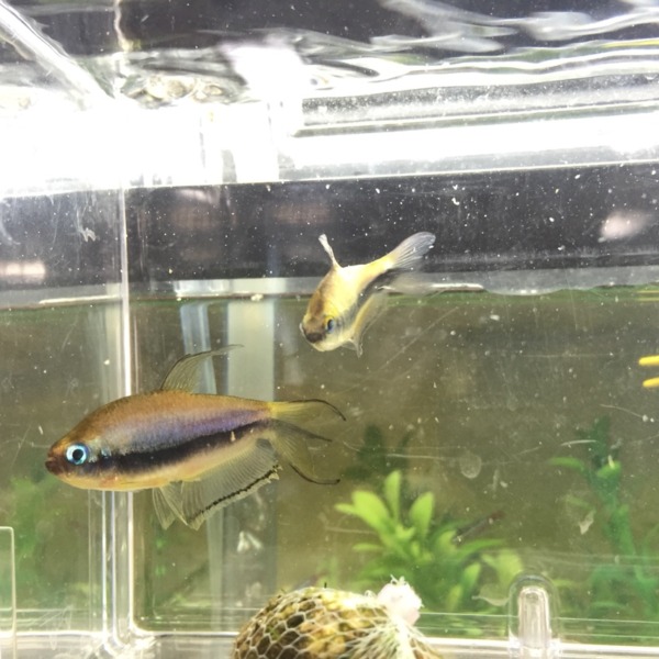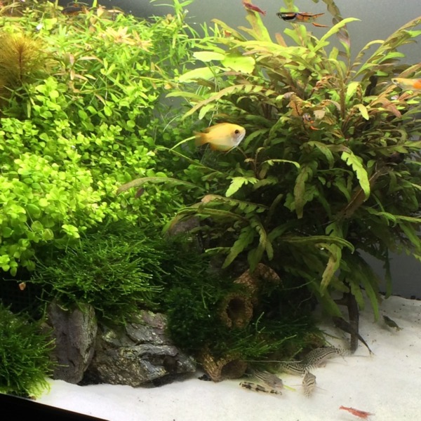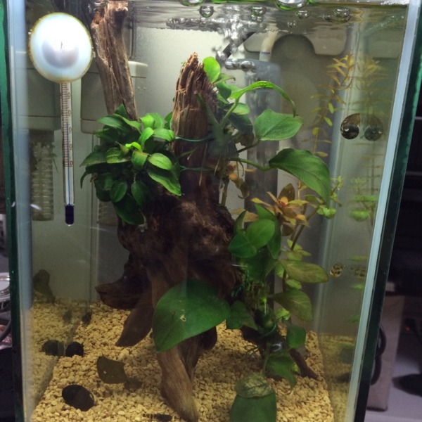 アベニーとバンブルビー水槽です。 17×17×25だったかな。 底面フィルター、ろ過砂...