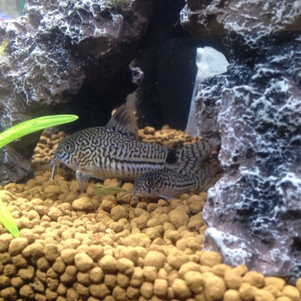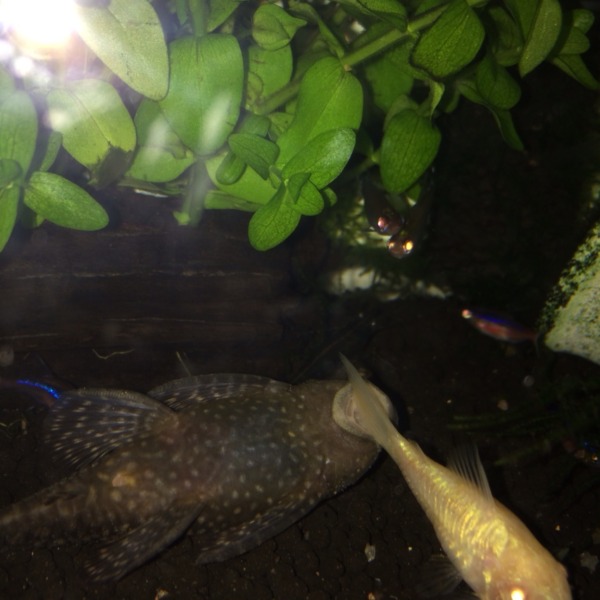 コリの尾がガンガン口の中に入っても仰向けで寝続けるプレコ…