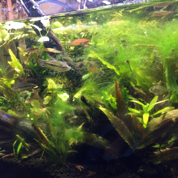 ソイルにこびりつく様に謎のコケ?が着いてきました。 藍藻でしょうか? 水面には...