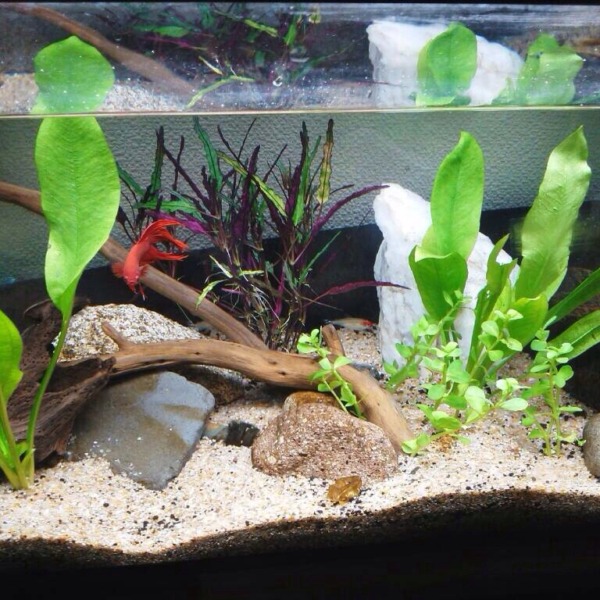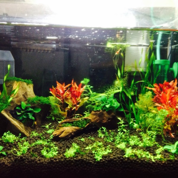 おかんがアクアリウム始めました 自分の元水槽使っております流木は海で拾ってきま...