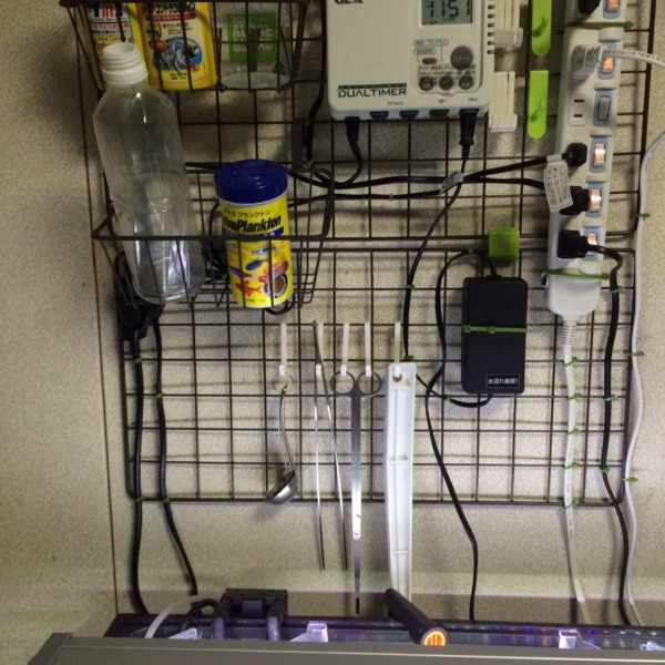 100均でワイヤーネットとフック、インシュロックを買ってきてコンセント類は全て水...