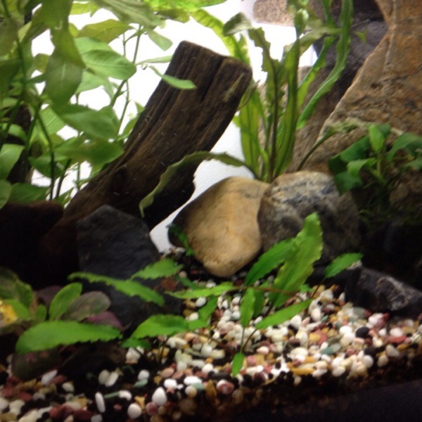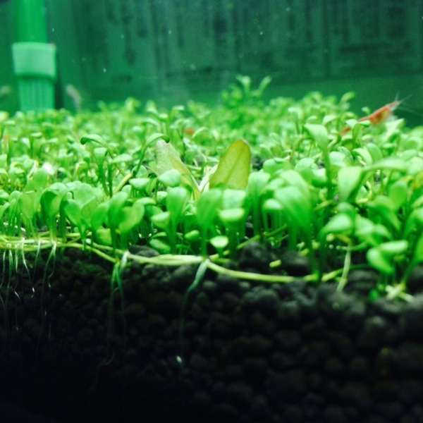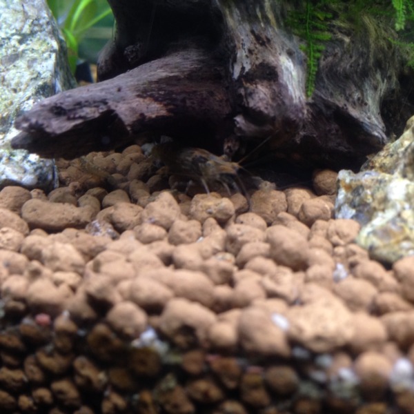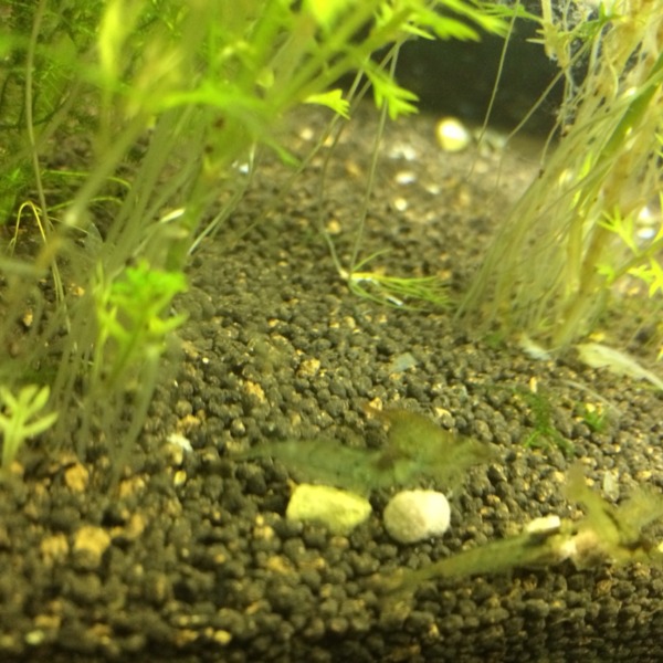 知らぬ間にミナミヌマエビの稚エビが水槽内にたくさんいました。 大人エビの左右に...