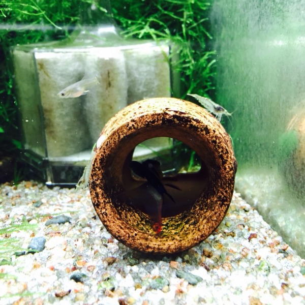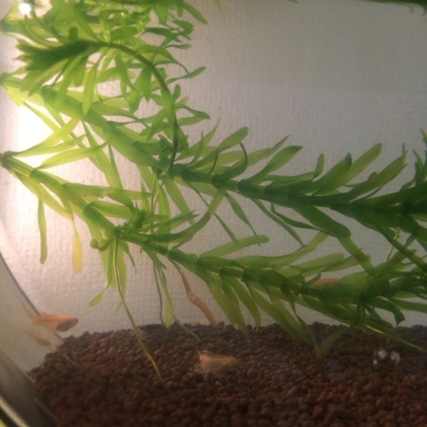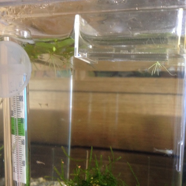 稚エビ達も1cm位に育ってきました。ショップでオマケでもらった浮き草の裏を好んで...