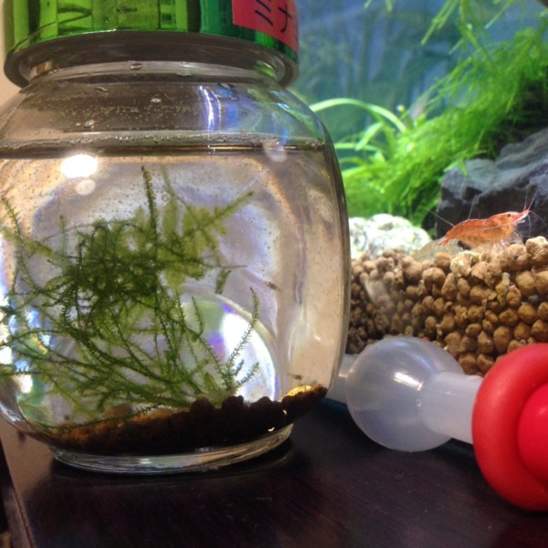サテライトで生まれた稚エビ12日目。スポイトで100均の瓶に引越ししました。