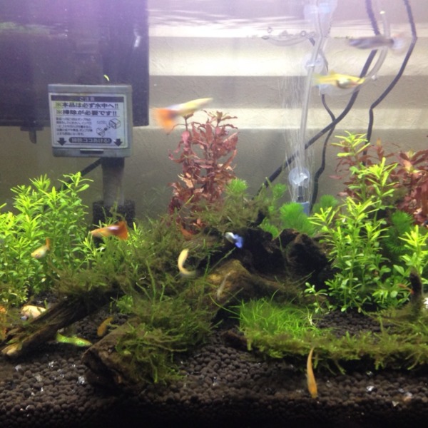水草、グッピー、ミナミヌマエビ入れてみました!とりあえず固形のCO2だすやつを入...