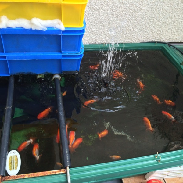 金魚ベランダです。 手前は、宇野系らんちゅう。奥はショートテール琉金。 水槽は...