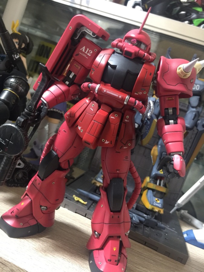 MGシャア専用ザクver.2.0 全塗装仕上げ!ジョニーライデン機を投稿しようと思いましたがこちらの方が手間暇がかかったので色々とアドバイスお願いします!見ての通りシンプルな出で立ちですがメタルボール埋め込み モールド追加などで情報量を増やしています!ショルダースパイクは少し長い物に変更しました!全塗装なのでフレームの見えない部分まで全て塗装しています!そのため各可動部分が