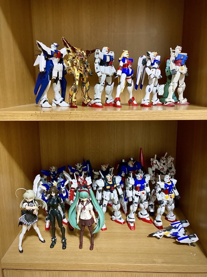 いつもガンプラ飾ってる棚を撮影してみました。 上段は全てHG、下段はフィギュア