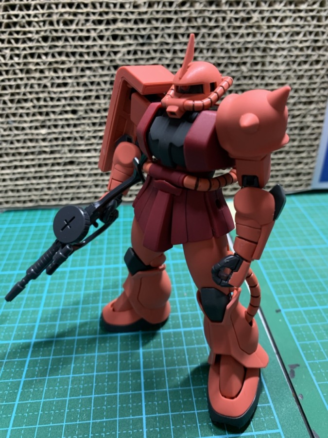 リバイブ版シャアザクスミ入れとつや消しの簡単フィニッシュで仕上げました!ゲート跡とかスミ入れが汚くなっちゃったのが残念だけど、落ち着いた色合いになってくれてよかった(≧∇≦)