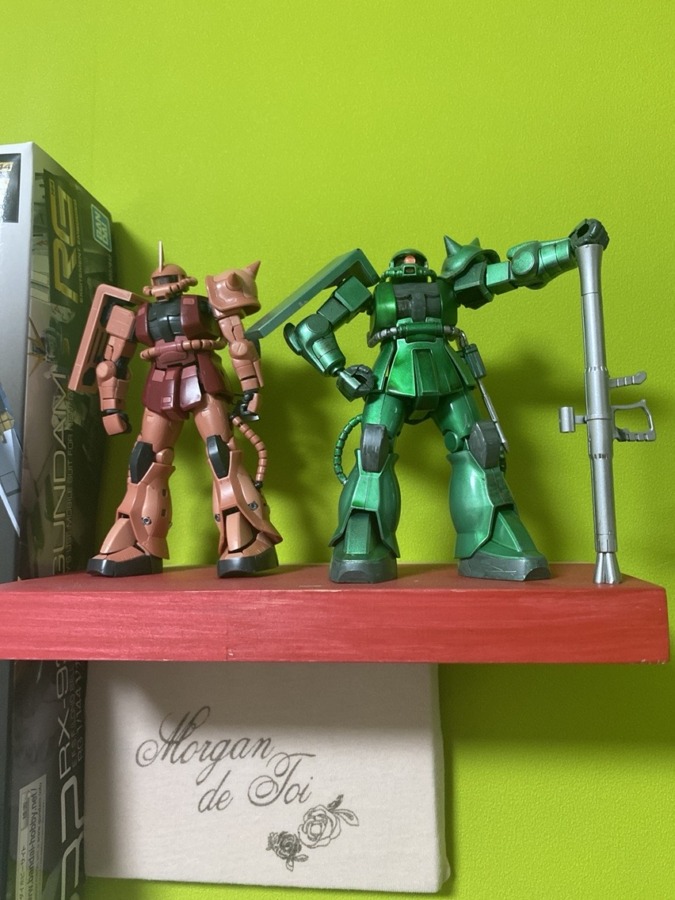 エコプラザク「お供いたします。」RGシャア専用ザク「あぁたのむ…しかし、しかしだぁ、肩のシールド固定甘いのは仕様なのか」エコプラザク「はっ、本機は異常ありません!」RGシャア専用ザク「う、動かなければどうということはない。」